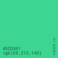 Цвет #3CD591 в цветовой модели RGB обозначается тремя октетами (60, 213, 145) в десятичном формате и #3CD591 в шестнадцатиричном (hex) формате, которые являются интенсивностью красного 60 (hex 3C), интенсивность зелёного 213 (hex D5) и интенсивность синего 145 (hex 91).