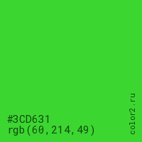 Цвет #3CD631 в цветовой модели RGB обозначается тремя октетами (60, 214, 49) в десятичном формате и #3CD631 в шестнадцатиричном (hex) формате, которые являются интенсивностью красного 60 (hex 3C), интенсивность зелёного 214 (hex D6) и интенсивность синего 49 (hex 31).