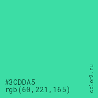 Цвет #3CDDA5 в цветовой модели RGB обозначается тремя октетами (60, 221, 165) в десятичном формате и #3CDDA5 в шестнадцатиричном (hex) формате, которые являются интенсивностью красного 60 (hex 3C), интенсивность зелёного 221 (hex DD) и интенсивность синего 165 (hex A5).
