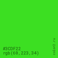 Цвет #3CDF22 в цветовой модели RGB обозначается тремя октетами (60, 223, 34) в десятичном формате и #3CDF22 в шестнадцатиричном (hex) формате, которые являются интенсивностью красного 60 (hex 3C), интенсивность зелёного 223 (hex DF) и интенсивность синего 34 (hex 22).