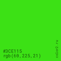 Цвет #3CE115 в цветовой модели RGB обозначается тремя октетами (60, 225, 21) в десятичном формате и #3CE115 в шестнадцатиричном (hex) формате, которые являются интенсивностью красного 60 (hex 3C), интенсивность зелёного 225 (hex E1) и интенсивность синего 21 (hex 15).