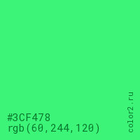 Цвет #3CF478 в цветовой модели RGB обозначается тремя октетами (60, 244, 120) в десятичном формате и #3CF478 в шестнадцатиричном (hex) формате, которые являются интенсивностью красного 60 (hex 3C), интенсивность зелёного 244 (hex F4) и интенсивность синего 120 (hex 78).