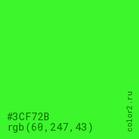 Цвет #3CF72B в цветовой модели RGB обозначается тремя октетами (60, 247, 43) в десятичном формате и #3CF72B в шестнадцатиричном (hex) формате, которые являются интенсивностью красного 60 (hex 3C), интенсивность зелёного 247 (hex F7) и интенсивность синего 43 (hex 2B).
