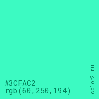 Цвет #3CFAC2 в цветовой модели RGB обозначается тремя октетами (60, 250, 194) в десятичном формате и #3CFAC2 в шестнадцатиричном (hex) формате, которые являются интенсивностью красного 60 (hex 3C), интенсивность зелёного 250 (hex FA) и интенсивность синего 194 (hex C2).