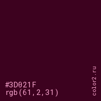 Цвет #3D021F в цветовой модели RGB обозначается тремя октетами (61, 2, 31) в десятичном формате и #3D021F в шестнадцатиричном (hex) формате, которые являются интенсивностью красного 61 (hex 3D), интенсивность зелёного 2 (hex 02) и интенсивность синего 31 (hex 1F).