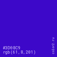 Цвет #3D08C9 в цветовой модели RGB обозначается тремя октетами (61, 8, 201) в десятичном формате и #3D08C9 в шестнадцатиричном (hex) формате, которые являются интенсивностью красного 61 (hex 3D), интенсивность зелёного 8 (hex 08) и интенсивность синего 201 (hex C9).