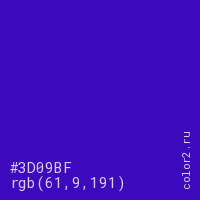 Цвет #3D09BF в цветовой модели RGB обозначается тремя октетами (61, 9, 191) в десятичном формате и #3D09BF в шестнадцатиричном (hex) формате, которые являются интенсивностью красного 61 (hex 3D), интенсивность зелёного 9 (hex 09) и интенсивность синего 191 (hex BF).