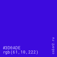 Цвет #3D0ADE в цветовой модели RGB обозначается тремя октетами (61, 10, 222) в десятичном формате и #3D0ADE в шестнадцатиричном (hex) формате, которые являются интенсивностью красного 61 (hex 3D), интенсивность зелёного 10 (hex 0A) и интенсивность синего 222 (hex DE).