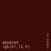 Цвет #3D0C09 в цветовой модели RGB обозначается тремя октетами (61, 12, 9) в десятичном формате и #3D0C09 в шестнадцатиричном (hex) формате, которые являются интенсивностью красного 61 (hex 3D), интенсивность зелёного 12 (hex 0C) и интенсивность синего 9 (hex 09).