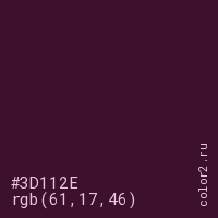 Цвет #3D112E в цветовой модели RGB обозначается тремя октетами (61, 17, 46) в десятичном формате и #3D112E в шестнадцатиричном (hex) формате, которые являются интенсивностью красного 61 (hex 3D), интенсивность зелёного 17 (hex 11) и интенсивность синего 46 (hex 2E).