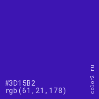 Цвет #3D15B2 в цветовой модели RGB обозначается тремя октетами (61, 21, 178) в десятичном формате и #3D15B2 в шестнадцатиричном (hex) формате, которые являются интенсивностью красного 61 (hex 3D), интенсивность зелёного 21 (hex 15) и интенсивность синего 178 (hex B2).