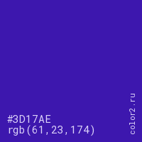 Цвет #3D17AE в цветовой модели RGB обозначается тремя октетами (61, 23, 174) в десятичном формате и #3D17AE в шестнадцатиричном (hex) формате, которые являются интенсивностью красного 61 (hex 3D), интенсивность зелёного 23 (hex 17) и интенсивность синего 174 (hex AE).