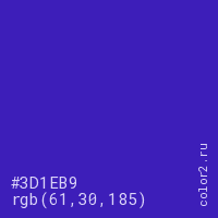 Цвет #3D1EB9 в цветовой модели RGB обозначается тремя октетами (61, 30, 185) в десятичном формате и #3D1EB9 в шестнадцатиричном (hex) формате, которые являются интенсивностью красного 61 (hex 3D), интенсивность зелёного 30 (hex 1E) и интенсивность синего 185 (hex B9).