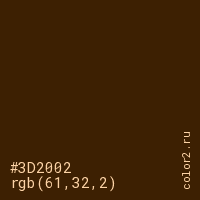 Цвет #3D2002 в цветовой модели RGB обозначается тремя октетами (61, 32, 2) в десятичном формате и #3D2002 в шестнадцатиричном (hex) формате, которые являются интенсивностью красного 61 (hex 3D), интенсивность зелёного 32 (hex 20) и интенсивность синего 2 (hex 02).