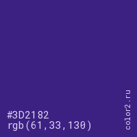 Цвет #3D2182 в цветовой модели RGB обозначается тремя октетами (61, 33, 130) в десятичном формате и #3D2182 в шестнадцатиричном (hex) формате, которые являются интенсивностью красного 61 (hex 3D), интенсивность зелёного 33 (hex 21) и интенсивность синего 130 (hex 82).