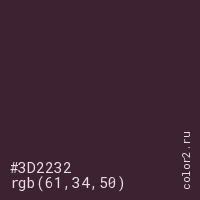 Цвет #3D2232 в цветовой модели RGB обозначается тремя октетами (61, 34, 50) в десятичном формате и #3D2232 в шестнадцатиричном (hex) формате, которые являются интенсивностью красного 61 (hex 3D), интенсивность зелёного 34 (hex 22) и интенсивность синего 50 (hex 32).