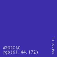 Цвет #3D2CAC в цветовой модели RGB обозначается тремя октетами (61, 44, 172) в десятичном формате и #3D2CAC в шестнадцатиричном (hex) формате, которые являются интенсивностью красного 61 (hex 3D), интенсивность зелёного 44 (hex 2C) и интенсивность синего 172 (hex AC).