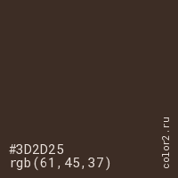 Цвет #3D2D25 в цветовой модели RGB обозначается тремя октетами (61, 45, 37) в десятичном формате и #3D2D25 в шестнадцатиричном (hex) формате, которые являются интенсивностью красного 61 (hex 3D), интенсивность зелёного 45 (hex 2D) и интенсивность синего 37 (hex 25).
