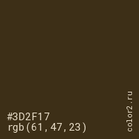 Цвет #3D2F17 в цветовой модели RGB обозначается тремя октетами (61, 47, 23) в десятичном формате и #3D2F17 в шестнадцатиричном (hex) формате, которые являются интенсивностью красного 61 (hex 3D), интенсивность зелёного 47 (hex 2F) и интенсивность синего 23 (hex 17).