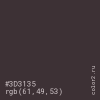 Цвет #3D3135 в цветовой модели RGB обозначается тремя октетами (61, 49, 53) в десятичном формате и #3D3135 в шестнадцатиричном (hex) формате, которые являются интенсивностью красного 61 (hex 3D), интенсивность зелёного 49 (hex 31) и интенсивность синего 53 (hex 35).