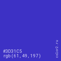 Цвет #3D31C5 в цветовой модели RGB обозначается тремя октетами (61, 49, 197) в десятичном формате и #3D31C5 в шестнадцатиричном (hex) формате, которые являются интенсивностью красного 61 (hex 3D), интенсивность зелёного 49 (hex 31) и интенсивность синего 197 (hex C5).