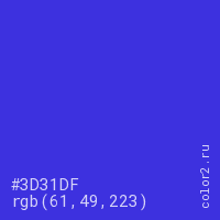 Цвет #3D31DF в цветовой модели RGB обозначается тремя октетами (61, 49, 223) в десятичном формате и #3D31DF в шестнадцатиричном (hex) формате, которые являются интенсивностью красного 61 (hex 3D), интенсивность зелёного 49 (hex 31) и интенсивность синего 223 (hex DF).