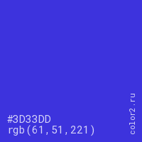 Цвет #3D33DD в цветовой модели RGB обозначается тремя октетами (61, 51, 221) в десятичном формате и #3D33DD в шестнадцатиричном (hex) формате, которые являются интенсивностью красного 61 (hex 3D), интенсивность зелёного 51 (hex 33) и интенсивность синего 221 (hex DD).