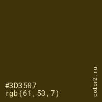 Цвет #3D3507 в цветовой модели RGB обозначается тремя октетами (61, 53, 7) в десятичном формате и #3D3507 в шестнадцатиричном (hex) формате, которые являются интенсивностью красного 61 (hex 3D), интенсивность зелёного 53 (hex 35) и интенсивность синего 7 (hex 07).