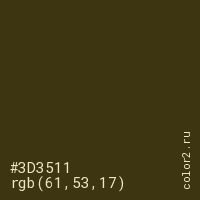 Цвет #3D3511 в цветовой модели RGB обозначается тремя октетами (61, 53, 17) в десятичном формате и #3D3511 в шестнадцатиричном (hex) формате, которые являются интенсивностью красного 61 (hex 3D), интенсивность зелёного 53 (hex 35) и интенсивность синего 17 (hex 11).