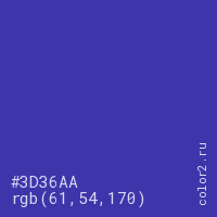Цвет #3D36AA в цветовой модели RGB обозначается тремя октетами (61, 54, 170) в десятичном формате и #3D36AA в шестнадцатиричном (hex) формате, которые являются интенсивностью красного 61 (hex 3D), интенсивность зелёного 54 (hex 36) и интенсивность синего 170 (hex AA).