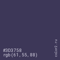 Цвет #3D3758 в цветовой модели RGB обозначается тремя октетами (61, 55, 88) в десятичном формате и #3D3758 в шестнадцатиричном (hex) формате, которые являются интенсивностью красного 61 (hex 3D), интенсивность зелёного 55 (hex 37) и интенсивность синего 88 (hex 58).