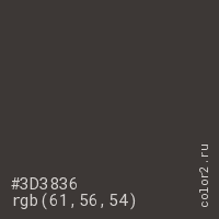 Цвет #3D3836 в цветовой модели RGB обозначается тремя октетами (61, 56, 54) в десятичном формате и #3D3836 в шестнадцатиричном (hex) формате, которые являются интенсивностью красного 61 (hex 3D), интенсивность зелёного 56 (hex 38) и интенсивность синего 54 (hex 36).