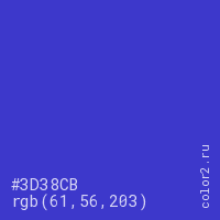 Цвет #3D38CB в цветовой модели RGB обозначается тремя октетами (61, 56, 203) в десятичном формате и #3D38CB в шестнадцатиричном (hex) формате, которые являются интенсивностью красного 61 (hex 3D), интенсивность зелёного 56 (hex 38) и интенсивность синего 203 (hex CB).