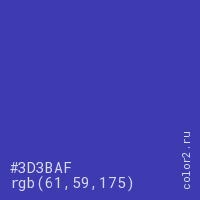 Цвет #3D3BAF в цветовой модели RGB обозначается тремя октетами (61, 59, 175) в десятичном формате и #3D3BAF в шестнадцатиричном (hex) формате, которые являются интенсивностью красного 61 (hex 3D), интенсивность зелёного 59 (hex 3B) и интенсивность синего 175 (hex AF).