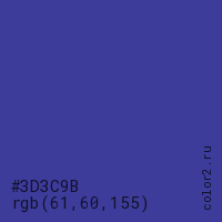 Цвет #3D3C9B в цветовой модели RGB обозначается тремя октетами (61, 60, 155) в десятичном формате и #3D3C9B в шестнадцатиричном (hex) формате, которые являются интенсивностью красного 61 (hex 3D), интенсивность зелёного 60 (hex 3C) и интенсивность синего 155 (hex 9B).