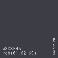 Цвет #3D3E45 в цветовой модели RGB обозначается тремя октетами (61, 62, 69) в десятичном формате и #3D3E45 в шестнадцатиричном (hex) формате, которые являются интенсивностью красного 61 (hex 3D), интенсивность зелёного 62 (hex 3E) и интенсивность синего 69 (hex 45).