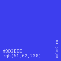 Цвет #3D3EEE в цветовой модели RGB обозначается тремя октетами (61, 62, 238) в десятичном формате и #3D3EEE в шестнадцатиричном (hex) формате, которые являются интенсивностью красного 61 (hex 3D), интенсивность зелёного 62 (hex 3E) и интенсивность синего 238 (hex EE).