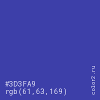 Цвет #3D3FA9 в цветовой модели RGB обозначается тремя октетами (61, 63, 169) в десятичном формате и #3D3FA9 в шестнадцатиричном (hex) формате, которые являются интенсивностью красного 61 (hex 3D), интенсивность зелёного 63 (hex 3F) и интенсивность синего 169 (hex A9).