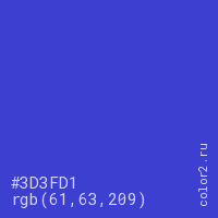Цвет #3D3FD1 в цветовой модели RGB обозначается тремя октетами (61, 63, 209) в десятичном формате и #3D3FD1 в шестнадцатиричном (hex) формате, которые являются интенсивностью красного 61 (hex 3D), интенсивность зелёного 63 (hex 3F) и интенсивность синего 209 (hex D1).