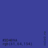 Цвет #3D409A в цветовой модели RGB обозначается тремя октетами (61, 64, 154) в десятичном формате и #3D409A в шестнадцатиричном (hex) формате, которые являются интенсивностью красного 61 (hex 3D), интенсивность зелёного 64 (hex 40) и интенсивность синего 154 (hex 9A).