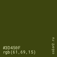 Цвет #3D450F в цветовой модели RGB обозначается тремя октетами (61, 69, 15) в десятичном формате и #3D450F в шестнадцатиричном (hex) формате, которые являются интенсивностью красного 61 (hex 3D), интенсивность зелёного 69 (hex 45) и интенсивность синего 15 (hex 0F).