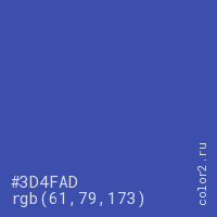 Цвет #3D4FAD в цветовой модели RGB обозначается тремя октетами (61, 79, 173) в десятичном формате и #3D4FAD в шестнадцатиричном (hex) формате, которые являются интенсивностью красного 61 (hex 3D), интенсивность зелёного 79 (hex 4F) и интенсивность синего 173 (hex AD).