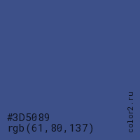 Цвет #3D5089 в цветовой модели RGB обозначается тремя октетами (61, 80, 137) в десятичном формате и #3D5089 в шестнадцатиричном (hex) формате, которые являются интенсивностью красного 61 (hex 3D), интенсивность зелёного 80 (hex 50) и интенсивность синего 137 (hex 89).