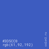 Цвет #3D5CC0 в цветовой модели RGB обозначается тремя октетами (61, 92, 192) в десятичном формате и #3D5CC0 в шестнадцатиричном (hex) формате, которые являются интенсивностью красного 61 (hex 3D), интенсивность зелёного 92 (hex 5C) и интенсивность синего 192 (hex C0).