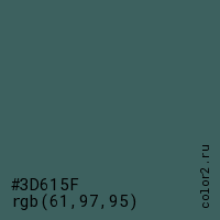 Цвет #3D615F в цветовой модели RGB обозначается тремя октетами (61, 97, 95) в десятичном формате и #3D615F в шестнадцатиричном (hex) формате, которые являются интенсивностью красного 61 (hex 3D), интенсивность зелёного 97 (hex 61) и интенсивность синего 95 (hex 5F).