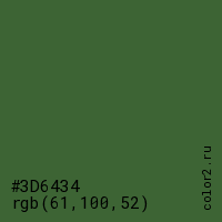 Цвет #3D6434 в цветовой модели RGB обозначается тремя октетами (61, 100, 52) в десятичном формате и #3D6434 в шестнадцатиричном (hex) формате, которые являются интенсивностью красного 61 (hex 3D), интенсивность зелёного 100 (hex 64) и интенсивность синего 52 (hex 34).