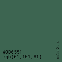 Цвет #3D6551 в цветовой модели RGB обозначается тремя октетами (61, 101, 81) в десятичном формате и #3D6551 в шестнадцатиричном (hex) формате, которые являются интенсивностью красного 61 (hex 3D), интенсивность зелёного 101 (hex 65) и интенсивность синего 81 (hex 51).