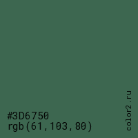 Цвет #3D6750 в цветовой модели RGB обозначается тремя октетами (61, 103, 80) в десятичном формате и #3D6750 в шестнадцатиричном (hex) формате, которые являются интенсивностью красного 61 (hex 3D), интенсивность зелёного 103 (hex 67) и интенсивность синего 80 (hex 50).