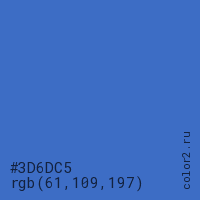 Цвет #3D6DC5 в цветовой модели RGB обозначается тремя октетами (61, 109, 197) в десятичном формате и #3D6DC5 в шестнадцатиричном (hex) формате, которые являются интенсивностью красного 61 (hex 3D), интенсивность зелёного 109 (hex 6D) и интенсивность синего 197 (hex C5).