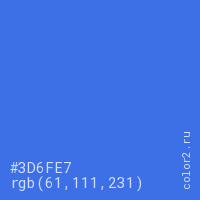 Цвет #3D6FE7 в цветовой модели RGB обозначается тремя октетами (61, 111, 231) в десятичном формате и #3D6FE7 в шестнадцатиричном (hex) формате, которые являются интенсивностью красного 61 (hex 3D), интенсивность зелёного 111 (hex 6F) и интенсивность синего 231 (hex E7).